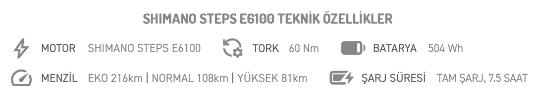 - Şarj Aleti: Shimano E-Bike Systems E6002 (%80 3,5 saat / %100 6,5 saat)