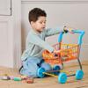 - Kutu da ne var? | Kalın saplı ve sabit tekerlekli turuncu ve mavi mini alışveriş arabası - Yiyecek, karton ve teneke kutular dahil.