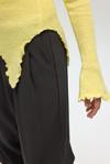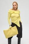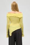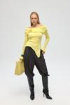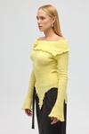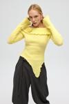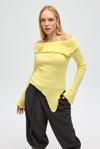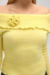 Bedene oturan formda, omzu açık, gül ve bürümcük detaylı, carmen yakalı, etek ucu asimetrik, uzun kollu triko kazak.