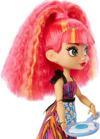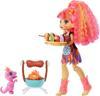 Emberly™ bebeğin hayvan desenli elbisesinin üzerinde önlüğü bulunur ve kızıl pembe saçları havalı bir atkuyruğu şeklinde toplanmıştır.