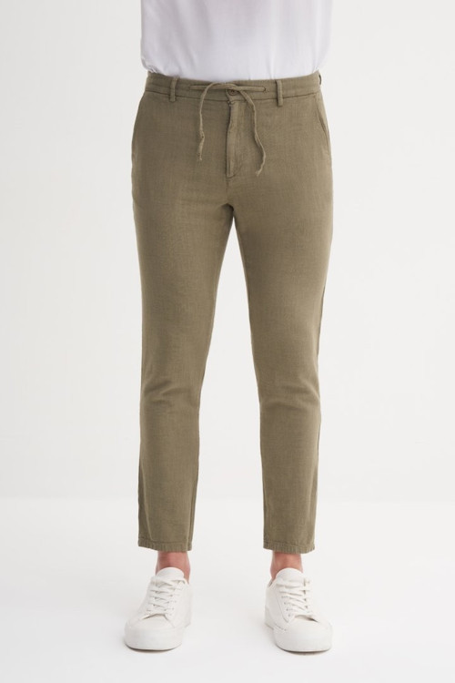 Bu pantolon, doğal ve rahat bir görünüm sunan haki tonunda tasarlanmıştır. Hafif ve nefes alabilen kumaşı sayesinde gün boyu konfor sağlar. Beli bağcıklı ve kemer köprülü yapısıyla hem spor hem de smart-casual kombinlere uyum sağlar. Dar paça kesimi modern bir siluet oluştururken, günlük kullanım için ideal bir şıklık sunar.