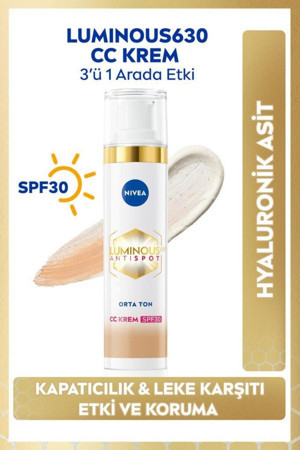 Nivea Luminous630 Koyu Leke Karşıtı CC Yüz Kremi 40ml, SPF30 Güneş Koruyucu, Hyaluronik Asit, Orta Ton