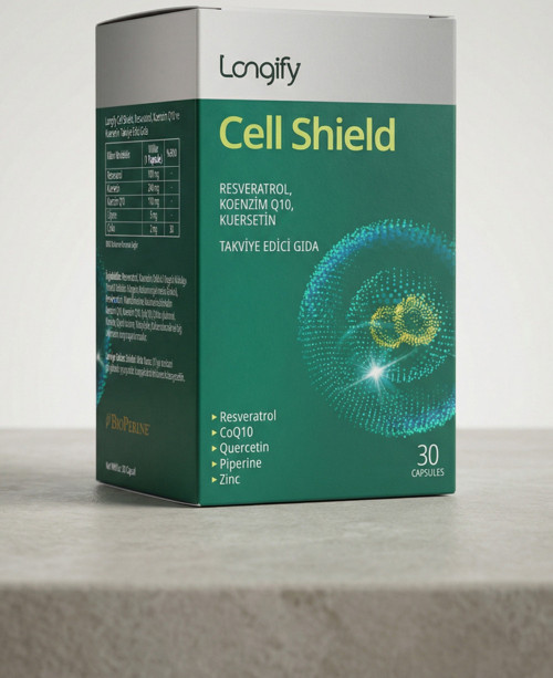 Longify Cell Shield; Resveratrol, Koenzim Q10, Kuersetin, Piperin, Çinko içeren bir gıda takviyesidir.