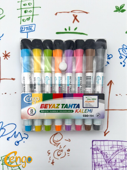 Cengo Manyetik Özellikli Doldurulabilir Silgili Tahta Kalemi 8 Li Set 8 Renk Silinebilir Beyaz Tahta Kalemidir. Tepesindeki Kapağı Silgili ve Mıknatıslıdır. Mürekkebi Uzun Ömürlüdür Beyaz yazı tahtalarına yazılabilir ve silgi ile silinebilir. Hem ıslak hem de kuru silme yapılabilir. Ürün arkasında keçe silgisi de mevcuttur. Manyetik yüzeylere tutunması için mıknatıslıdır.