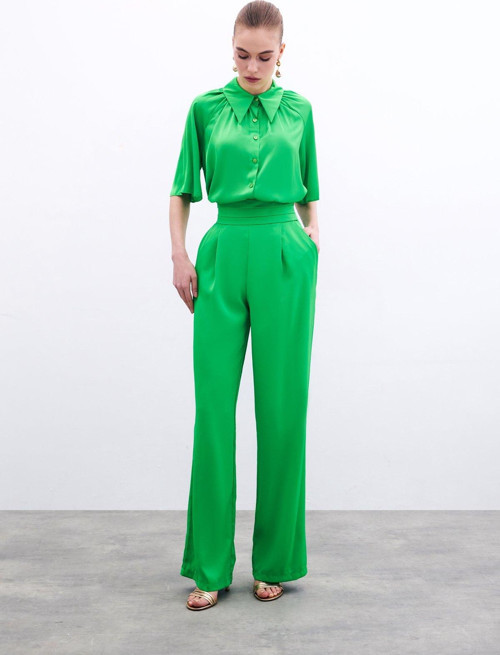 Yüksek bel, yan fermuarlı, bel detaylı, salaş paça, cepli saten pantolon.