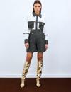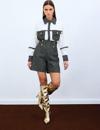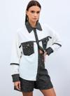 Ön gizli çıtçıtlı, düşük omuzlu, kapaklı ve süs düğmeli cep, kalça üstü boy, tüvitli salaş gömlek.