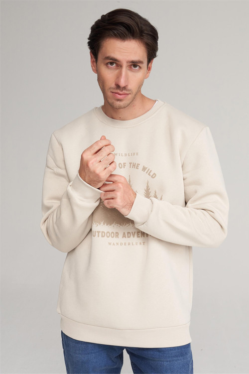 Çetinkaya Mentality 4005 3 İplik Bisiklet Yaka Baskılı Vizon Sweatshirt