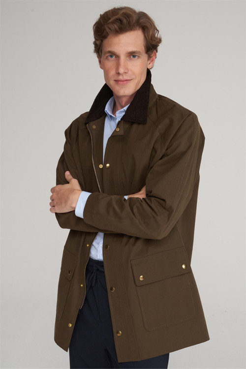 Bu şık mont, haki rengi ile dikkat çeker ve erkekler için özel olarak tasarlanmıştır.