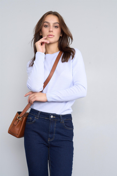 Bisiklet yaka tasarımı ile modern ve şık bir görünüm sunar. Triko kumaşı sayesinde yumuşak dokunuşuyla konforlu bir kullanım sağlar. Canlı lila ve mavi renkleriyle dikkat çekici bir stil oluşturur.