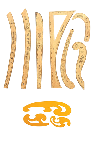 Kayın Renk Fransız 7 Parça Modelist Kalıp Çizim Seti – Gönye & Pistole / Pantolon, Ceket, Etek, Yaka