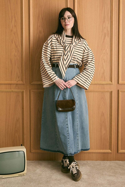 Ceylan Otantik Acı Kahve Fularlı 2 İplik Çizgili Body & Buz Mavisi Kot Kloş Etek Takım