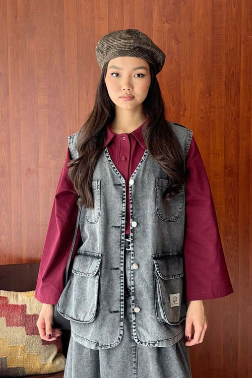 Bu kargo cepli kot yelek, hem şık hem de kullanışlıdır.