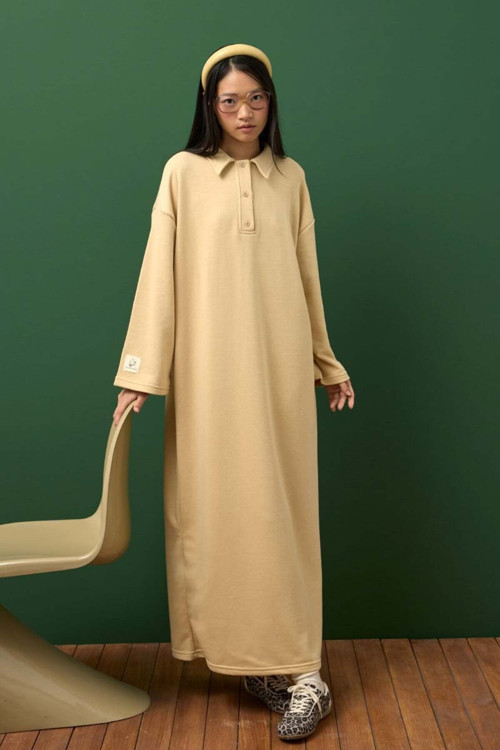Bu şık ve rahat 3 iplik yakalı uzun elbise, her an için harika bir seçenek.
