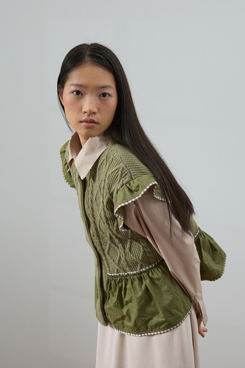 Bu fırfırlı triko yelek, hem şık hem de rahat bir görünüm sunar.