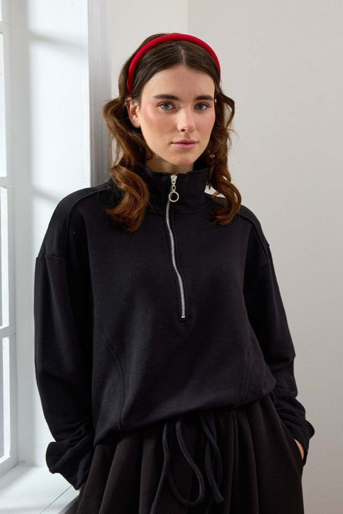 Ceylan Otantik Siyah 3 İplik Yarım Fermuarlı Sweat