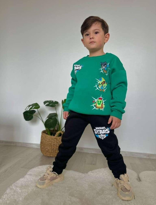 Brawl Stars temalı bu 3 iplik şardon sweatshirt ve eşofman takımı, erkek çocuklar için tasarlanmış modern ve şık bir kışlık kombin sunmaktadır. hem konfor hem de estetik açıdan mükemmel bir denge sağlamaktadır.