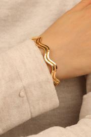 - Altın bilezik, zarif tasarımıyla dikkat çeker ve her türlü kıyafetle uyum sağlar.