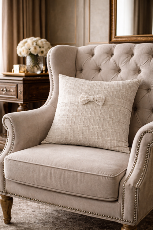 Madamiko Home Decor Chanel Tarzı Dokulu Fiyonklu Dekoratif Kırlent | Lüks Bej Koltuk Yastığı | El Yapımı Tasarım