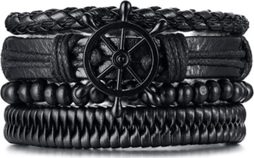 Siyah Deri 4 parça Erkek Bileklik. Ayarlanabilir bileklik boyu ile her bileğe uygundur. Boncuklu model lastiklidir. Toplam genişlik : 4,5 cm. Ağırlık : 19 gr.