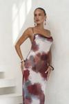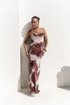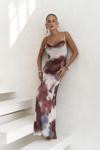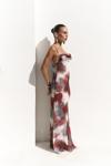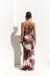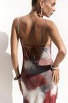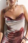 Astarsız, desenli tül elbise. İp askılı ve kolsuz.