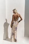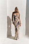 Astarsız, desenli tül elbise. İp askılı ve kolsuz.