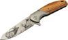 • Geyikli Ahşap Sap: Sap kısmındaki geyik temalı ahşap kaplama, çakının doğal ve şık bir görünüm kazanmasını sağlar. Ahşap yüzeyin işlenmiş ve detaylı tasarımı, çakının hem estetik hem de işlevsel açıdan dikkat çekici olmasını sağlar.