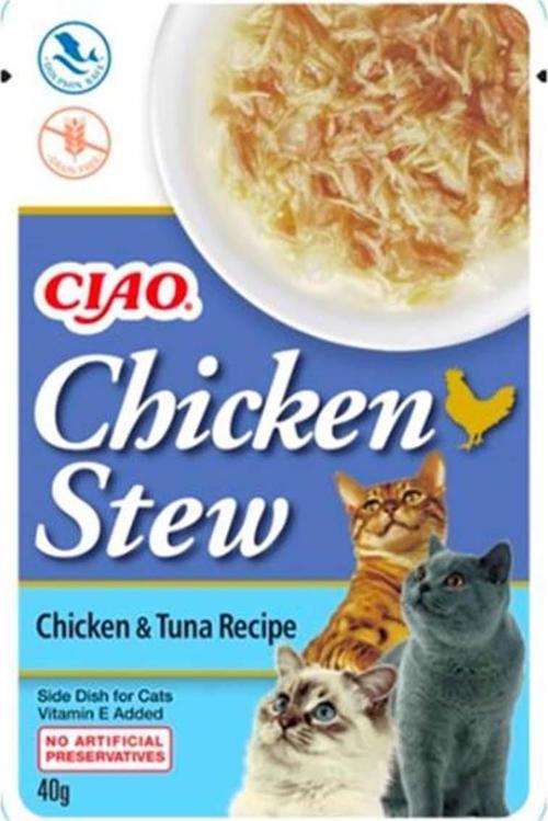 Ciao Tavuk Güveç ve Ton Balıklı Kedi Et Ezmesi, kedilerin keyifle yiyebileceği, %100 doğal tavuk eti ve ton balığı içeren, az kalorili ve yağ oranı dengeli olarak ayarlanmış, kısırlaştırılmış kediler için de uygun bir ödül maması çeşididir.