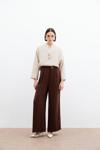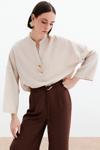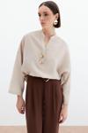 Hakim yaka, geniş kol, kalça boy, çiçek aksesuarlı keten bluz.