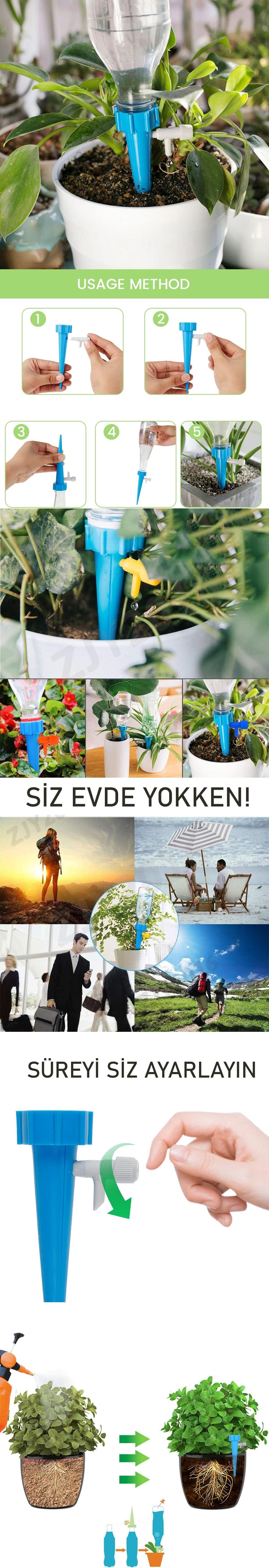 Kendi şişesi ucuna takılan aparatın damlama hızı/şiddeti yanındaki vanası ile ayarlanır ve toprağa batırılarak çiçeğin sürekli istediğiniz ölçüde sulanması sağlanır. Aynı zamanda herhangi bir 0,5 lt 1,5 lt gibi pet şişeleri de takabilirsiniz.