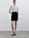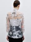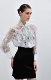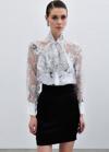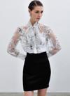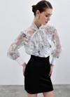 Yaka fularlı, geniş manşetli balon kol, kalça boy, astarsız, çiçek desenli gömlek.