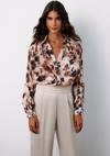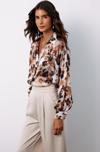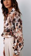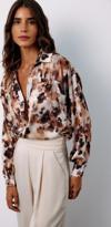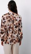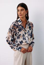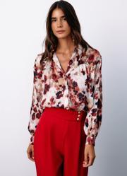 Ön yarım düğmeli, manşetli balon kol, büzgü detaylı, kalça altı boy, çiçek desenli salaş gömlek.