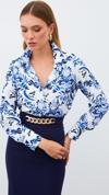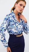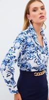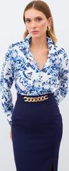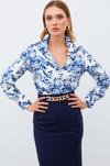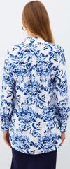 Ön düğmeli kapama, geniş manşetli uzun kol, kalça altı boy, çiçek desenli uzun gömlek.