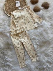 Tatlı çiçek desenleriyle süslenmiş bu ikili takım, kız çocuklar için hem rahat hem şık bir seçimdir. Uzun kollu üst kısmı fırfır detaylarıyla zarif bir görünüm sunarken, alt kısmı lastikli bel yapısıyla gün boyu konfor sağlar. Evde, okulda veya dışarıda günlük kullanım için idealdir.
