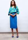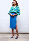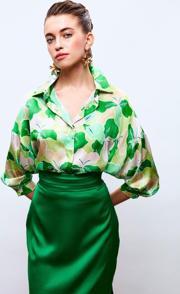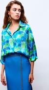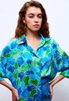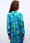 Ön gizli pat, yanlar mini yırtmaçlı, yarasa kol, uzun, çiçek desenli salaş gömlek.