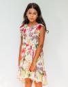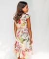 Bej rengi şifon üzerine çiçek desenli şifon elbise beli lastiklidir ve %100 pamuk astarlıdır