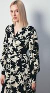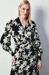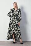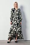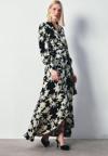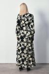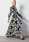 Katlı kruvaze yaka, yan fermuarlı kapama, birleşik süs kuşaklı, geniş manşetli balon kol, asimetrik kesim. çiçek desenli uzun elbise.