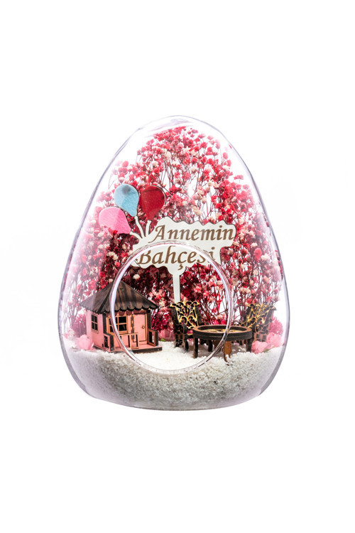 beyaz kum, kurutulmuş bitkiler, şoklanmış yosunlar, yapay mini güller,bir adet ahşap pembe ev, bir adet ahşap annemin bahçesi yazılı balonlu tabelave otantik ahşaptan bahçe mobilyalarını simgeleyen objelerle tamamlanmıştır. Evve ofis ortamlarının tamamında sergilenebilir teraryumun içinde canlı bitkibulunmadığından, herhangi bir bakıma ihtiyacı yoktur. Özellikle her ortamdayıllarca, zevkle izlenebilecek özel bir teraryumdur. Yaklaşık Ölçüleri