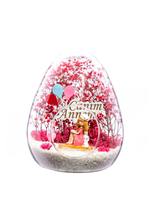 beyaz kum, kurutulmuşbitkiler, şoklanmış yosunlar, yapay çiçekler, bir adet simli kalp, bir adetahşap canım annem yazılı balonlu tabela ve bir adet şapkalı genç kadınısimgeleyen objelerle tamamlanmıştır. Ev ve ofis ortamlarının tamamındasergilenebilir teraryumun içinde canlı bitki bulunmadığından, herhangi birbakıma ihtiyacı yoktur. Özellikle her ortamda yıllarca, zevkle izlenebileceközel bir teraryumdur. Yaklaşık Ölçüleri