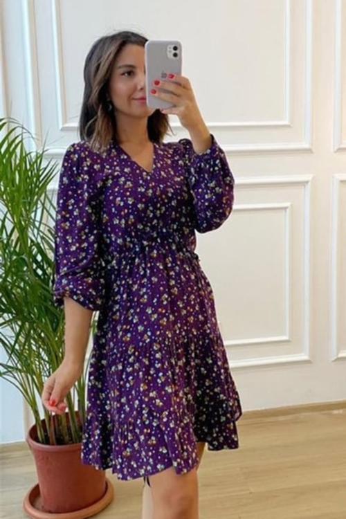 Mor çiçekli deseni, elbiseye feminen ve romantik bir hava katmaktadır.
