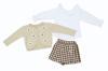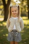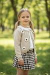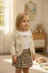 Set; krem rengi çiçek işlemeli hırka, fırfır yaka detaylı beyaz bluz ve kahverengi-ekose şort etekden oluşur.