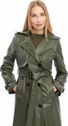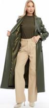 Trençkot, yumuşak ve dayanıklı deri malzeme kullanılarak üretilmiştir