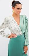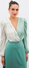 Kruvaze yaka, vatkalı, uzun lastikli kol, bel lastikli, alt çıtçıtlı, çift desenli bodysuit bluz.