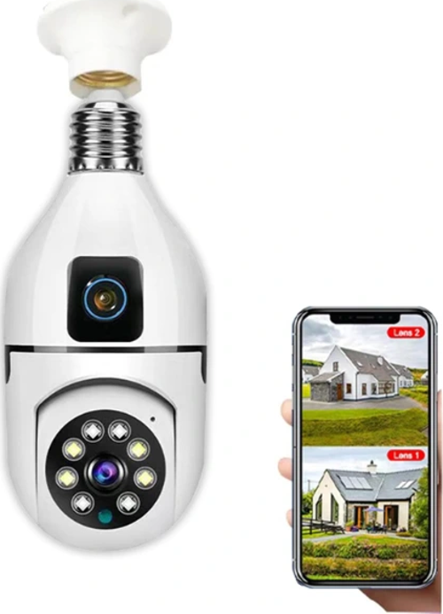 Çift lensli duy girişli kablosuz ampul kamera, pratik kurulumu ve gelişmiş güvenlik özellikleriyle dikkat çeker. E27 duy girişine kolayca monte edilerek ek adaptör gerektirmez. 4K Full HD çözünürlüğü ve 8 MP kamera kalitesi sayesinde net ve yüksek çözünürlüklü görüntüler sunar. 360° panoramik görüş açısı ile geniş alanları kapsar ve kör noktaları ortadan kaldırır.