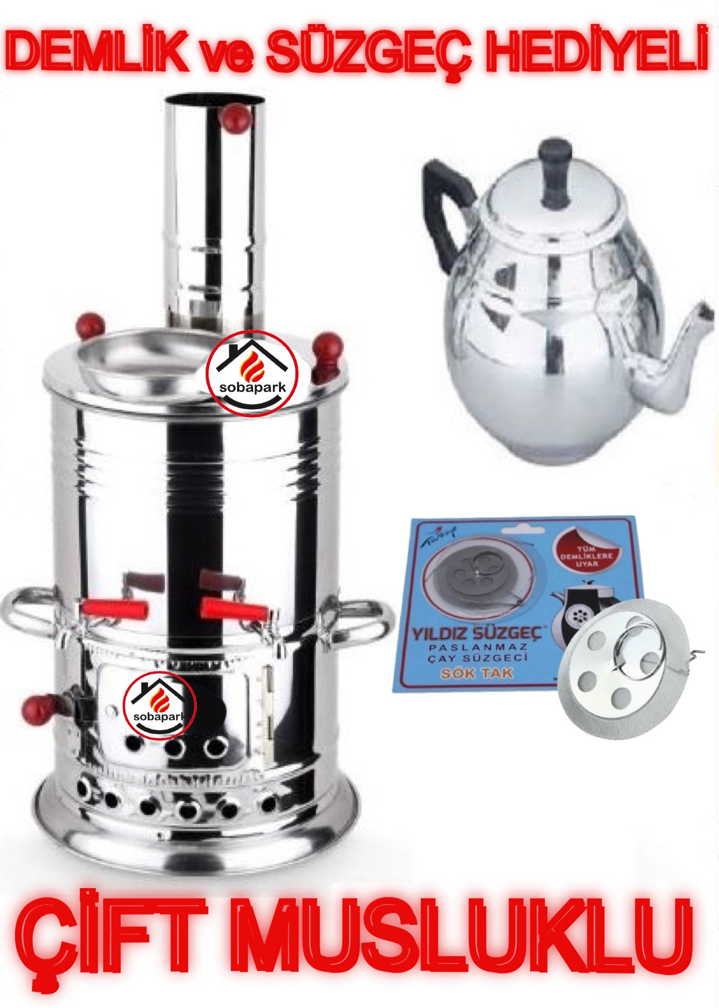 Sobapark Çift Musluklu Odunlu Kömürlü Paslanmaz Semaver Kendinden Demlikli Semaver Semaver 5 Lt Demlik 1 Lt
