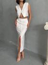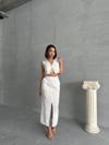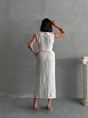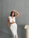 Terzi Bey markasının şık ve zarif tasarımıyla öne çıkan çilek takımı, etek ve yelek kombinasyonuyla dikkat çekiyor.