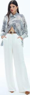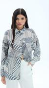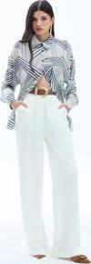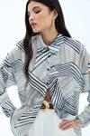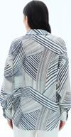 Ön düğmeli, düşük omuz, geniş manşetli uzun kol, kalça altı boy, çizgi desenli salaş gömlek.