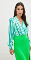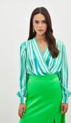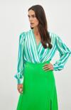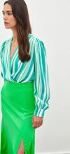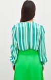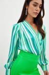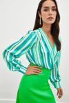 Kruvaze, manşetli balon kol, alt çıtçıtlı kapama, çizgili bodysuit bluz.
