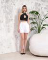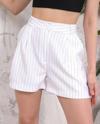 Çizgili düğmeli şort beyaz, şıklığı ve rahatlığı bir arada sunar. Yaz aylarının vazgeçilmez parçalarından biri olan bu şort ile şık kombinler oluşturabilirsiniz.