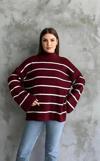 Kış aylarının vazgeçilmezi olan Çizgili İspanyol Kol Triko Boğazlı Kazak her stile kolayca uyum sağlar. Bordo rengi ve şık çizgileriyle dikkat çeken bu kazak, kadın giyim kategorisindeki favori parçalarınızdan biri olmaya aday.