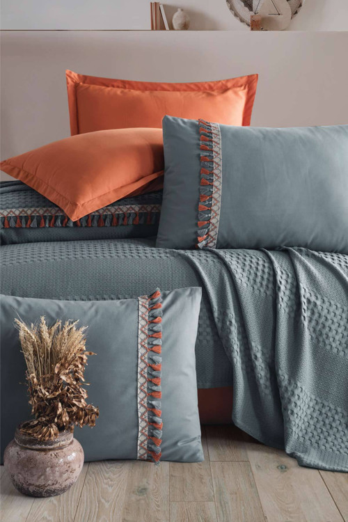 %100 Pamuktan üretilmektedir. Ebat ve İçerik: Püsküllü Pike : 160 x 240 cm Çarşaf : 180 x 240 cm Püsküllü Yastık Kılıfı : 50 x 70 (1)